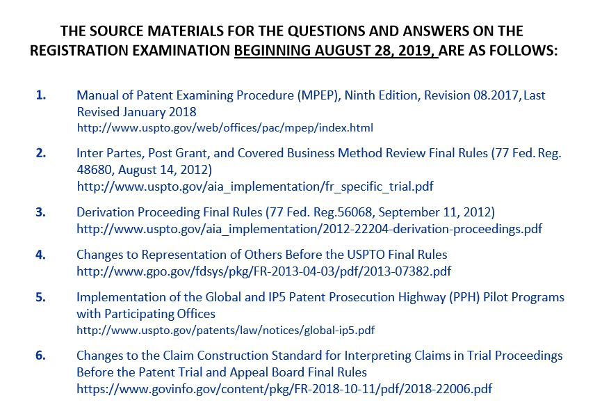注册专利代理人考试范围包括美国专利法规以及专利申请等程序方面的规定,内容主要源自美国专利法35 U.S.C.、联邦法规37 C.F.R.中涉及专利部分(类似于中国的《专利法实施细则》),以及美国专利商标局出版的the Manual of Patent Examination Procedure(MPEP)。MPEP与中国的《专利审查指南》类似,但其内容更详细、具体。美国专利商标局会不定期地以公报形式更新公布注册专利代理人考试范围,包括指定所使用的MPEP版本及考试涉及的USPTO已经颁布的规章制度等。由于美国的MPEP内容非常全面而详细,且书后附有相应美国专利法规,故考生准备考试时应以MPEP为主要复习材料。目前,考试使用的是2018年1月修订的第9版MPEP。