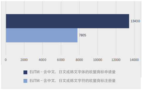 根据欧盟知识产权局(EUIPO)数据库的最新信息显示,自1996年4月1日以来,共有13430件中文、日文或韩文字符的欧盟商标(EUTM)申请案。目前,在这些申请中,有7805件申请被注册的欧盟商标,是由中文、日文或韩文字符组成或包含这些文字字符(见图1)。
