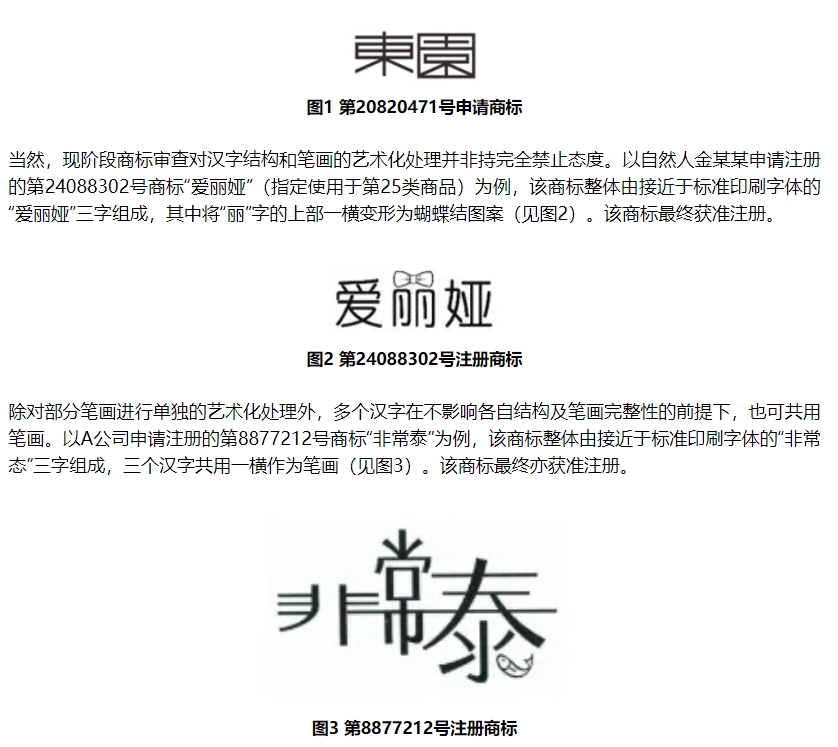 当前实践中,针对商标所使用的汉字设计字体,商标审查中通常要求其不能改变汉字的整体结构,也不能存在明显的笔画增减、讹误或过度变形等情形,否则可能以现行《商标法》第十条第一款第(八)项的绝对禁止事由(“有害于社会主义道德风尚或者有其他不良影响的”)而禁止其注册。