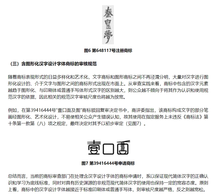 不过,就繁体字及异体字的使用而言,商标审查实践中依然为其留下了一定的空间。《商标审查审理指南》(2021)“商标审查审理编”第3.8.3.3节指出:“商标中使用的汉字,原则上要求是规范汉字。但考虑到商标工作的特殊性和我国香港特别行政区、澳门特别行政区和台湾地区的现实情况和历史传统,也可以使用繁体字,以及行书、草书、隶书、篆书等书法形式的汉字。”