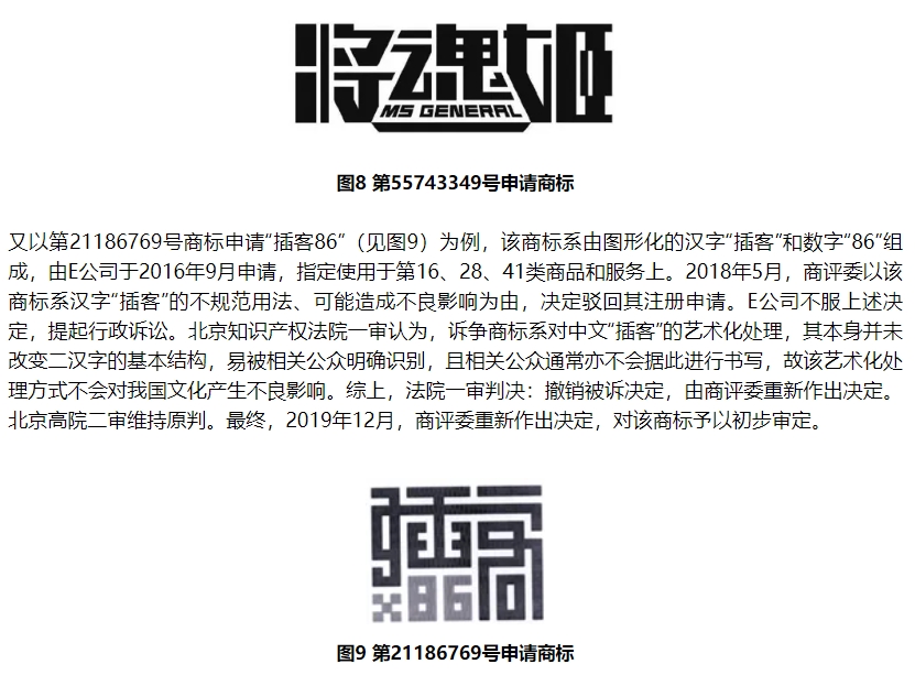 以第55743349号商标申请“将魂姬 MS GENERRL”(见图8)为例,该商标申请于2021年4月,指定使用于第28类“游戏机;填充玩具;玩具模型”等商品上。2022年2月,商评委以该商标中含不规范汉字、用作商标易产生不良社会影响为由,决定驳回其注册申请。申请人不服上述决定,提起行政诉讼。法院判决认为,本案申请商标为“将魂姬”汉字及英文“MS GENERRRL”组成的文字商标,其中“将魂姬”三个汉字经过艺术化处理,但并未改变三个汉字的基本结构,相关公众能够予以辨识,且通常不会据此进行书写,不构成不规范使用汉字的情形,不会对我国文化教育产生不良影响。最终,2022年7月,商评委重新作出决定,对该商标予以初步审定。