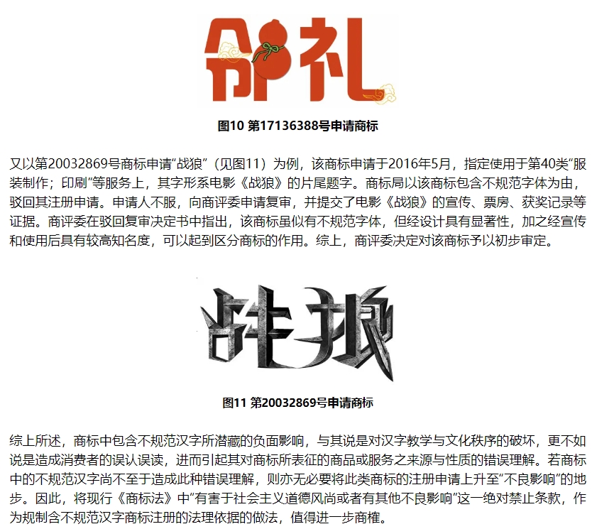以第17136388号商标申请“邻礼及图”(见图10)为例,该商标申请于2015年6月,指定使用于第42类“技术项目研究”等服务上。商评委以该商标构成《商标法》第十条第一款第(七)项所指情形(“带有欺骗性,容易使公众对商品的质量等特点或者产地产生误认的”)为由,决定驳回其注册申请。申请人不服,提起行政诉讼。北京知识产权法院一审认为,该诉争商标的部分文字被图形化设计,属于不规范字体,但不会造成相关公众对诉争商标指定使用服务的质量等特点或产地产生误认,也不会有错误的引导,不具有欺骗性,遂判决撤销被诉决定,由商评委对诉争商标的注册申请重新作出决定。北京高院二审维持原判。最终,2017年11月,商评委重新作出决定,对该商标予以初步审定。