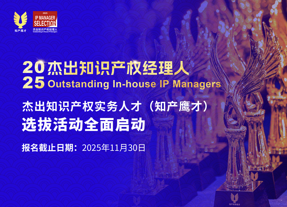 即日起,面向在华企业(国企、民企、三资企业)知识产权管理运营与法务人员开展“2025杰出知识产权经理人(知产鹰才)”的全面海选,报名截止时间为2025年11月30日。